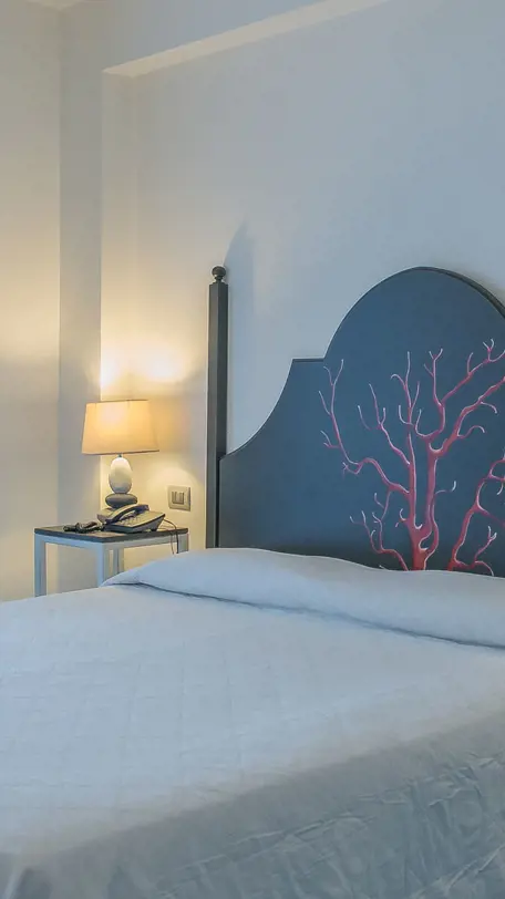 The room is furnished with Aeolian Style light coloured furniture . Services: SAT-TV, wi-fi, air-conditioning, minibar, telephone, safe and a large private terrace overlooking the sea.
