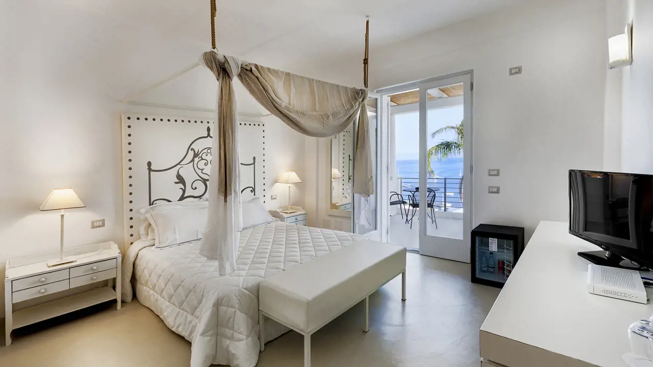 The room is furnished with Aeolian Style light coloured furniture. Services: SAT-TV, wi-fi, air-conditioning, minibar, telephone, safe and a large private terrace overlooking the sea.