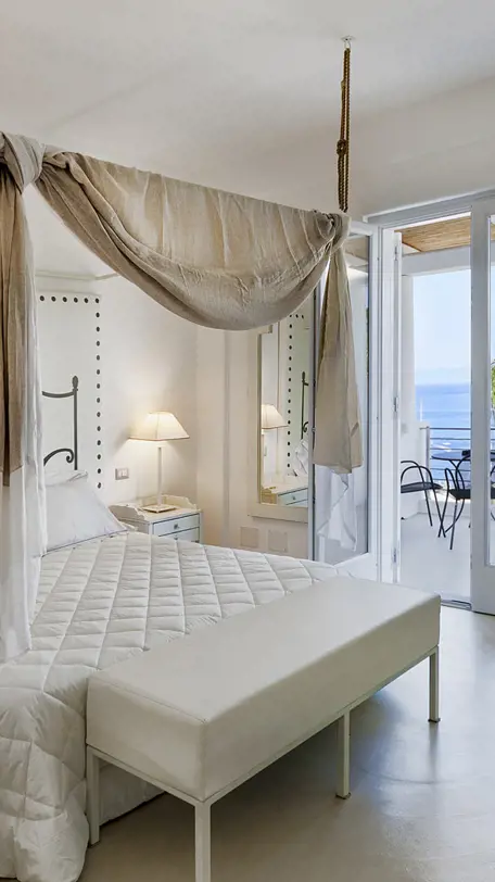 Seaview or garden view, Comfortable and cozy double or twin rooms, with Aeolian style furnishings, wood or wrought iron beds.