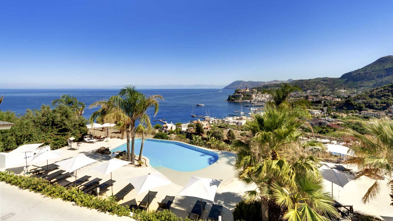 Yes, the hotel boasts a stunning infinity pool with panoramic views over the bay, the Lipari Castle, and—on clear days—the crater of Vulcano island in the distance.