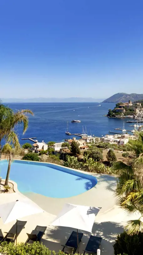 Yes, the hotel boasts a stunning infinity pool with panoramic views over the bay, the Lipari Castle, and—on clear days—the crater of Vulcano island in the distance.