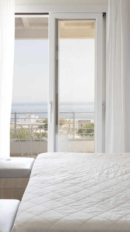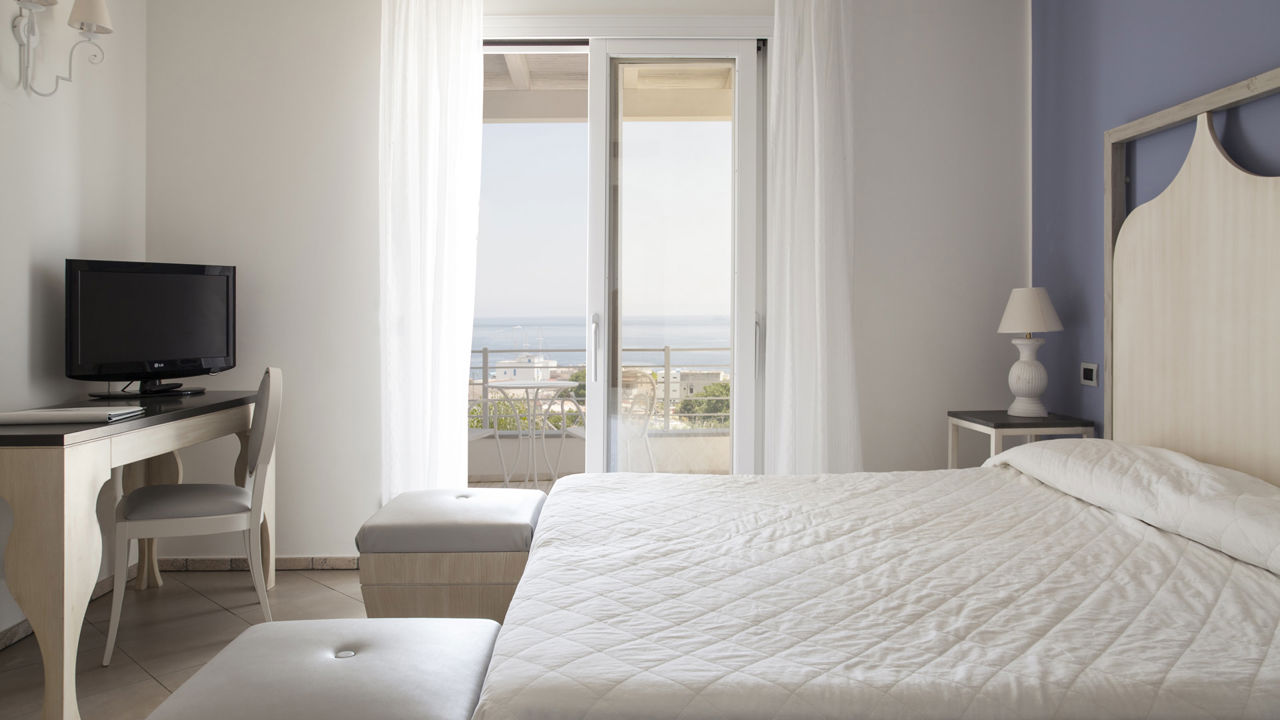 Le Camere, situate tra il 1° ed il 2° piano, sono arredate con mobili chiari e dispongono di TV-SAT, aria condizionata, internet wi-fi gratuito, minibar, telefono, cassaforte e ampio terrazzo privato coperto vista mare, alcune con solarium