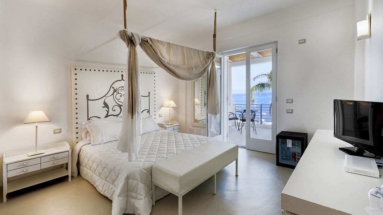 Le Camere arredate con mobili chiari, dispone di TV-SAT, wi-fi, aria condizionata, minibar, telefono, cassaforte e ampio terrazzo privato vista mare. Il bagno provvisto di doccia.